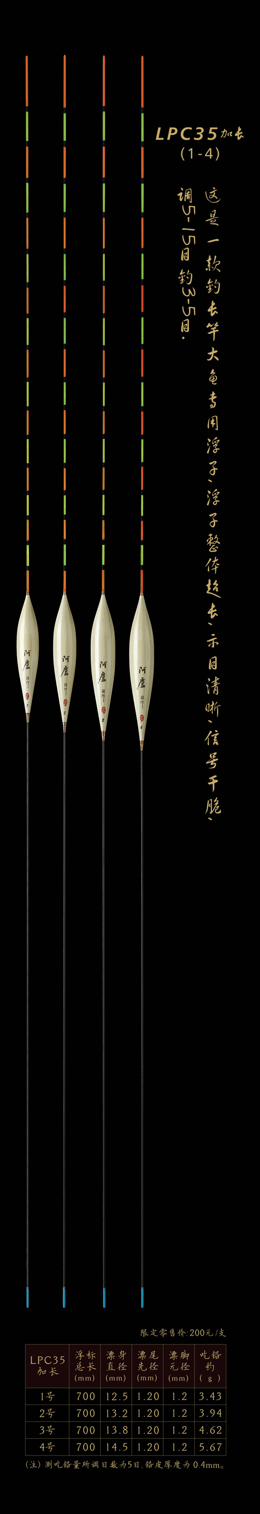 LPC35加長:釣長竿大魚專用浮子,浮子整體超長,示目清晰,信號干脆,調5—15目釣3—5目。
