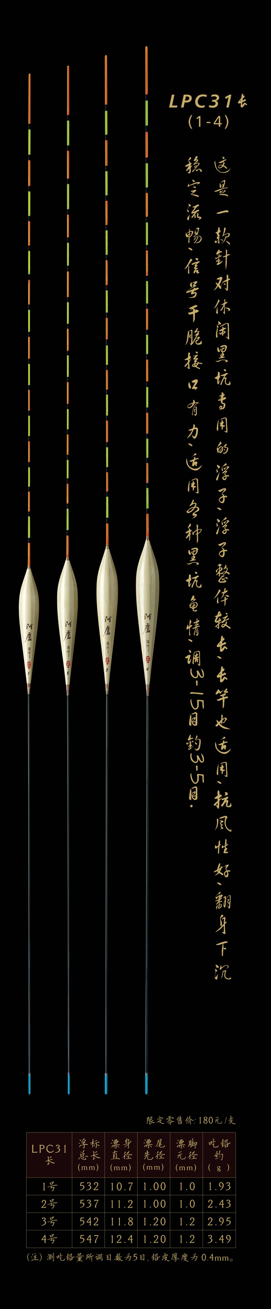 LPC31長:是一款針對休閑黑坑專用的浮子,浮子整體較長,長竿也適用,抗風性好,翻身下沉穩定流暢,信號干脆接口有力,適用各種黑坑魚情,調3—15目,釣3—5目。