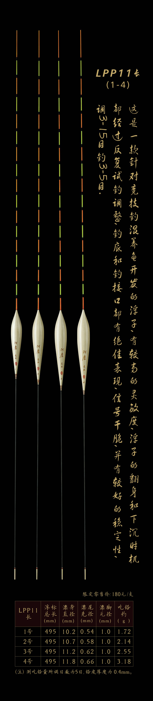 LPP11長:這是一款針對競技釣混養魚開發的浮子,有較高的靈敏度,浮子的翻身和下沉時機都經過反復試釣調整,釣底釣接口都有絕佳表現,信號干脆,并有較好的穩定性,調3—15目,釣3—5目。