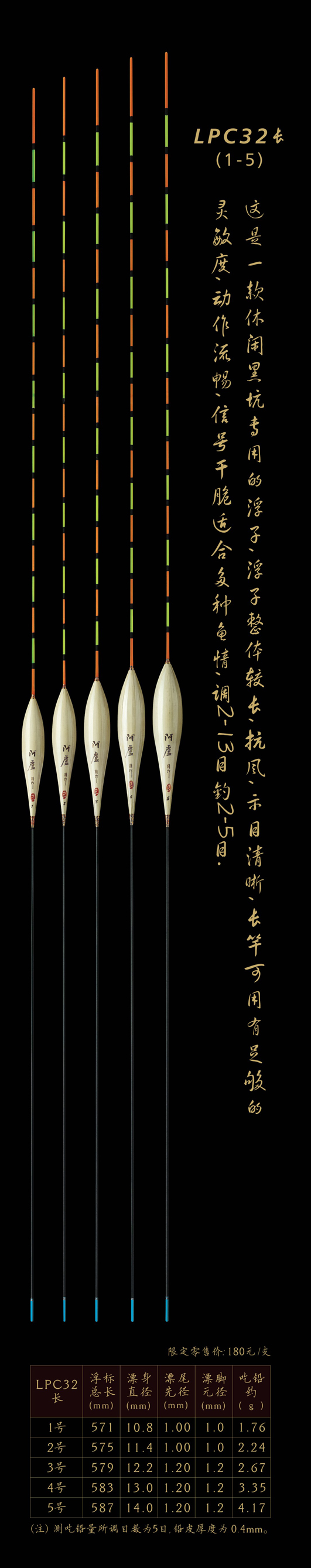 LPC32長:是一款休閑黑坑專用的浮子,浮子整體較長,抗風,示目清晰,長竿可用有足夠的靈敏度,動作流暢,信號干脆適合多種魚情,調2—13目,釣2-5目。