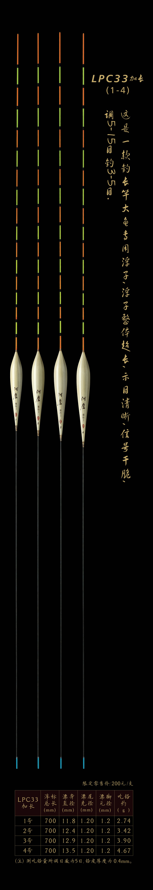 LPC33加長:釣長竿大魚專用浮子,浮子整體超長,示目清晰,信號干脆,調5—15目釣3—5目。