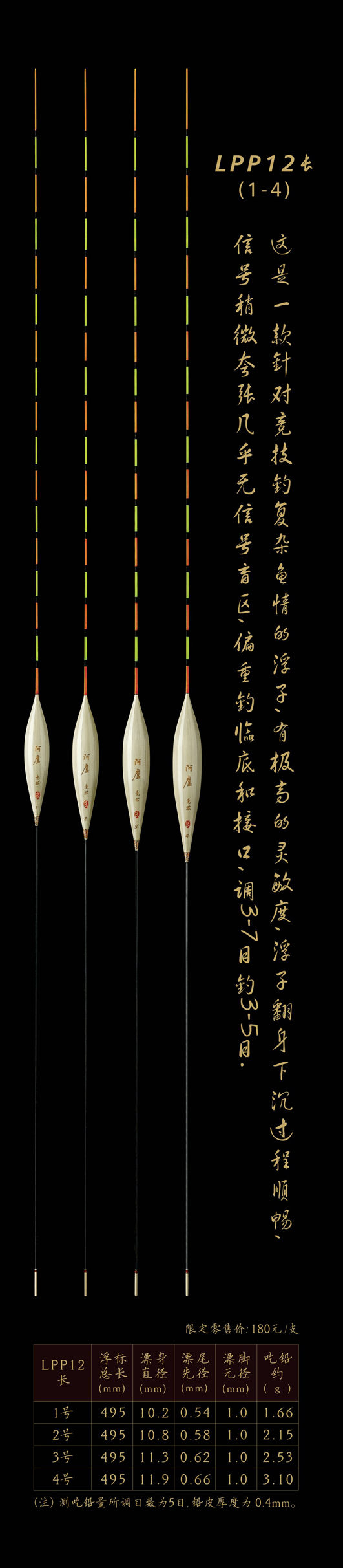 LPP12長:這是一款針對競技釣復雜魚情的浮子,有極高的靈敏度,浮子翻身下沉過程順暢,信號稍微夸張幾乎無信號盲區,偏重釣臨底和接口,調3—7目,釣3—5目。