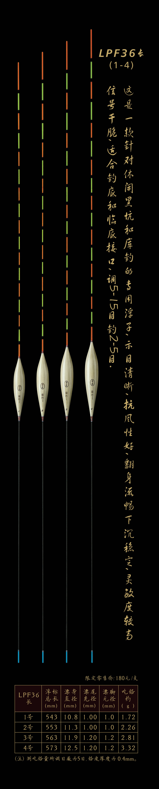 LPF36長:這是一款針對休閑黑坑和庫釣的專用浮子,示目清晰,抗風性好,翻身流暢下沉穩定,靈敏度較高信號干脆,適合釣底和臨底接口,調5—15目,釣2—5目.
